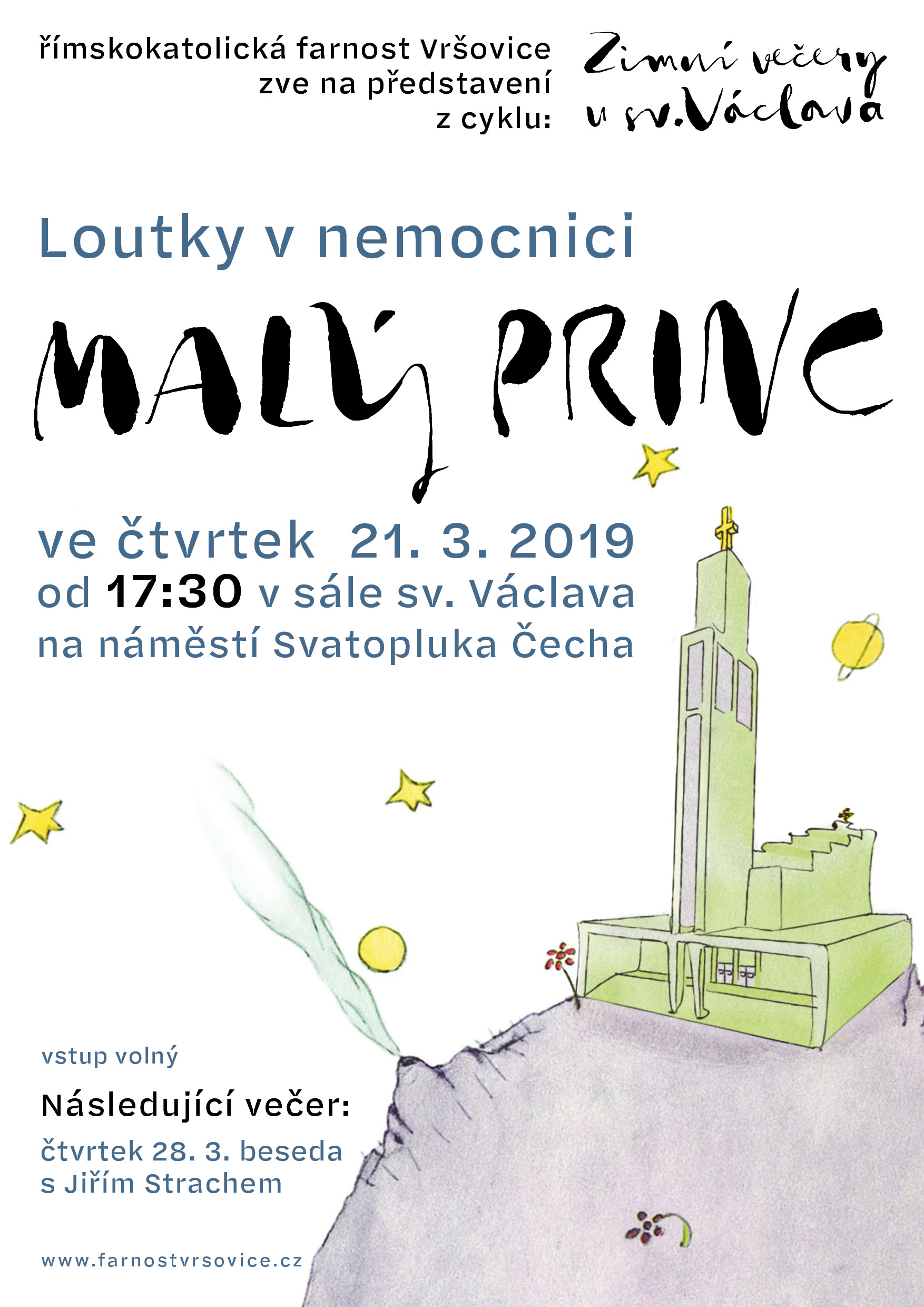 Ahoj, tenhle čtvrtek máme v sále sv. Václava v 17:30 loutkový divadlo zadara (+ občerstvení taky zadara). Tak přijďte, nebo dejte komukoliv dalšímu vědět!